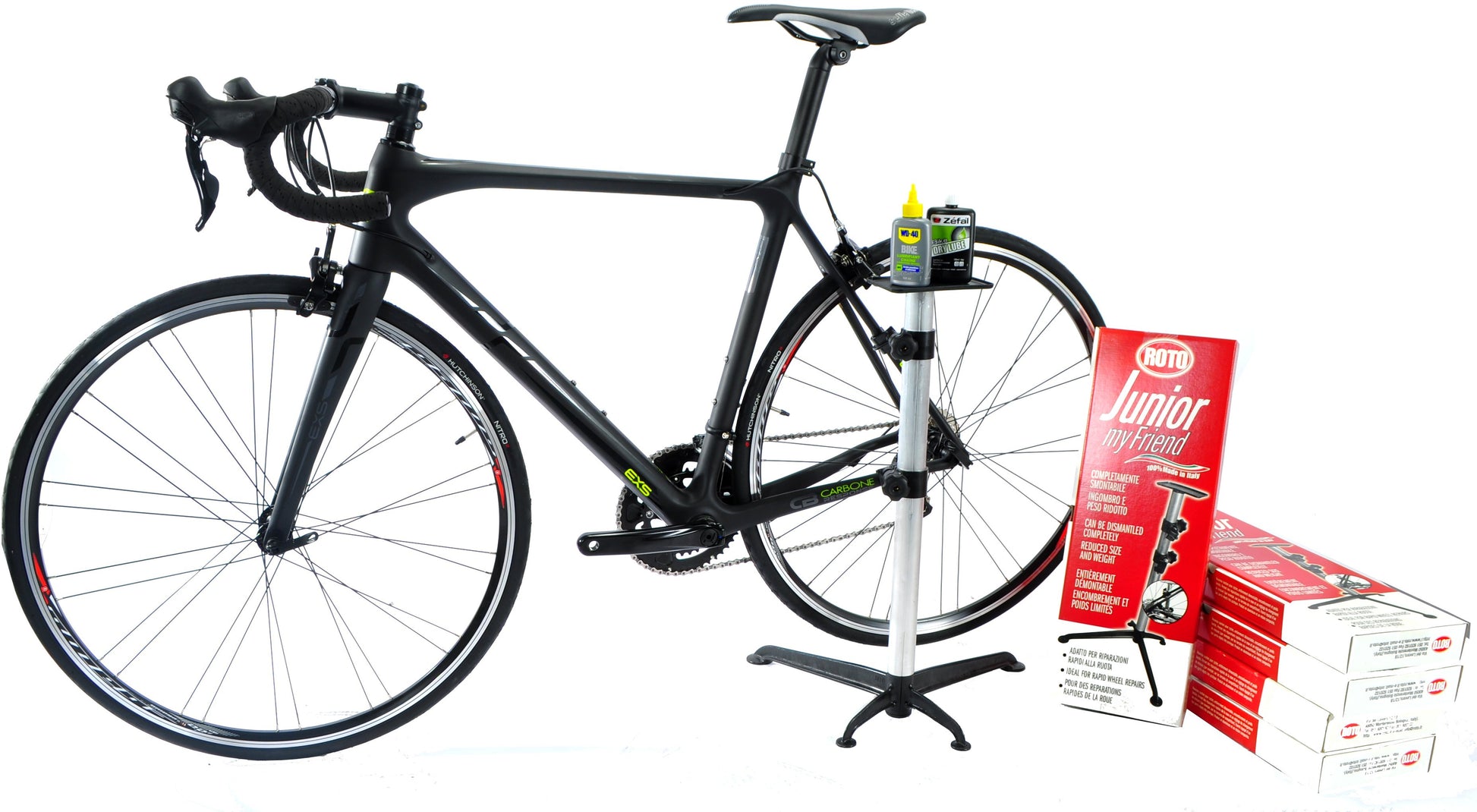 Pied d'atelier de réparation vélo "Roto Junior My Friend" en aluminium et entièrement démontable, offrant un encombrement et un poids réduits.