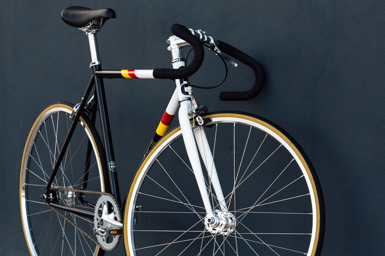 - State Bicycle 4130 Van Damme : Cadre noir et blanc avec bandes rouges et jaunes / Périphériques chromés