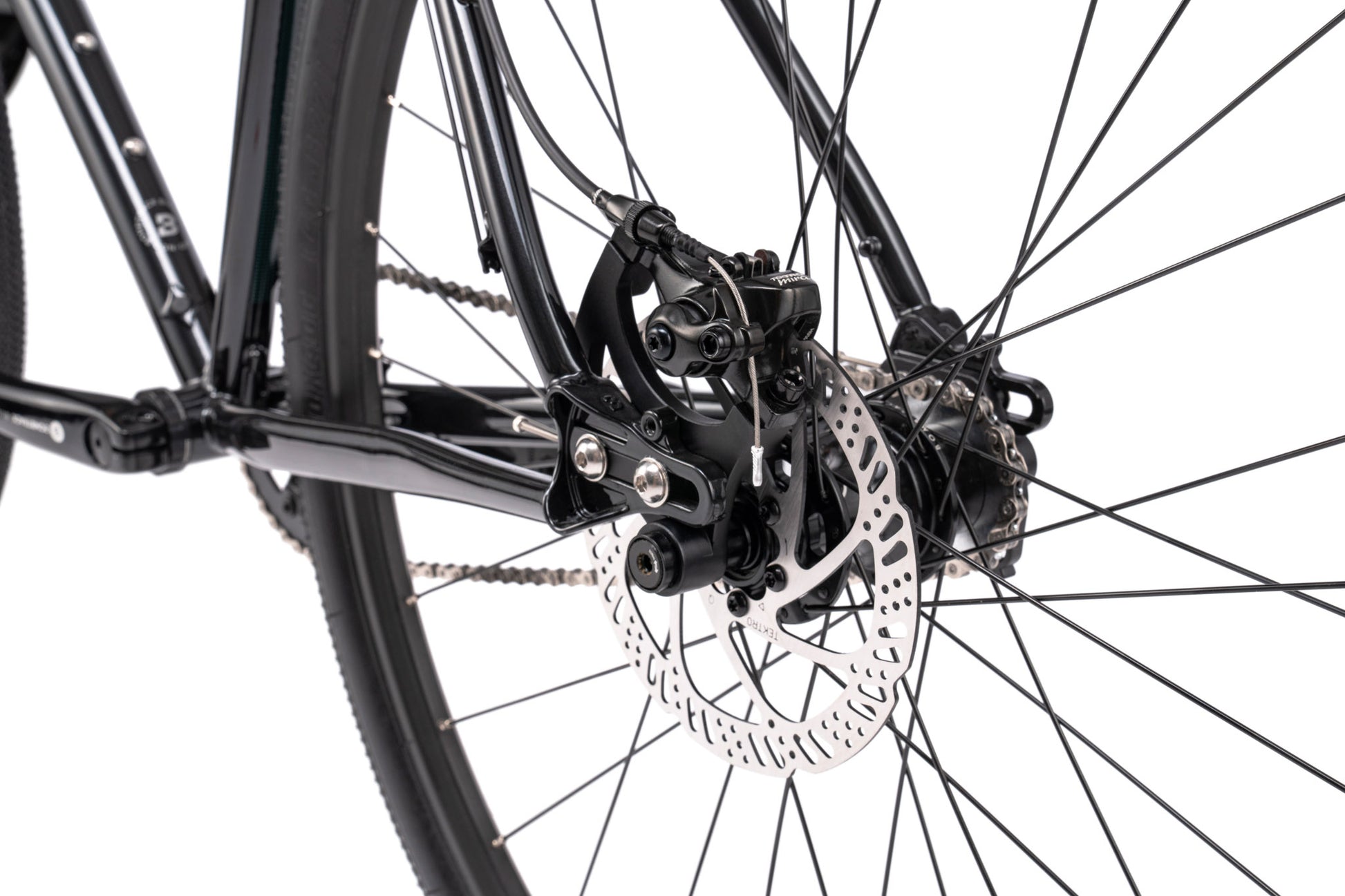 - Freins : Freins à disque mécaniques Tektro Mira avec rotors de 180 mm à l'avant et 160 mm à l'arrière